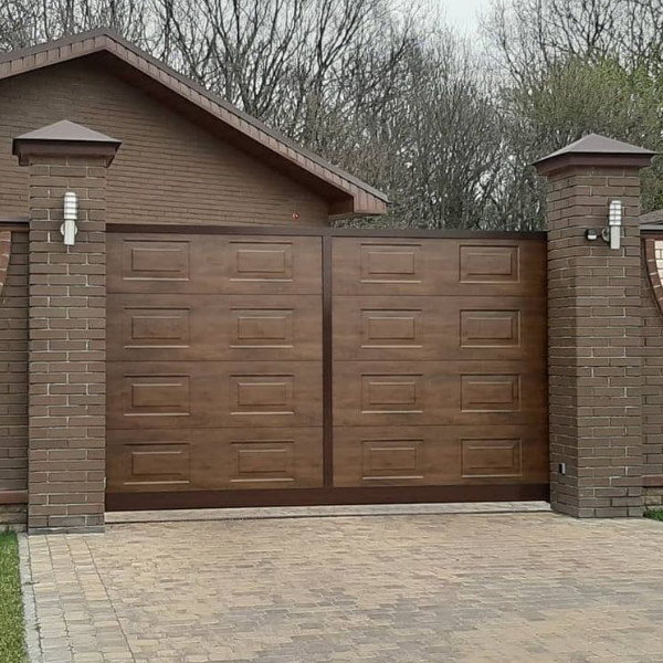 Ворота из сэндвич-панелей, имитирующих текстуру древесины (золотой дуб, темный дуб, вишня), обладают всеми преимуществами стальных ворот и придают коттеджу элементы престижа и индивидуальности.